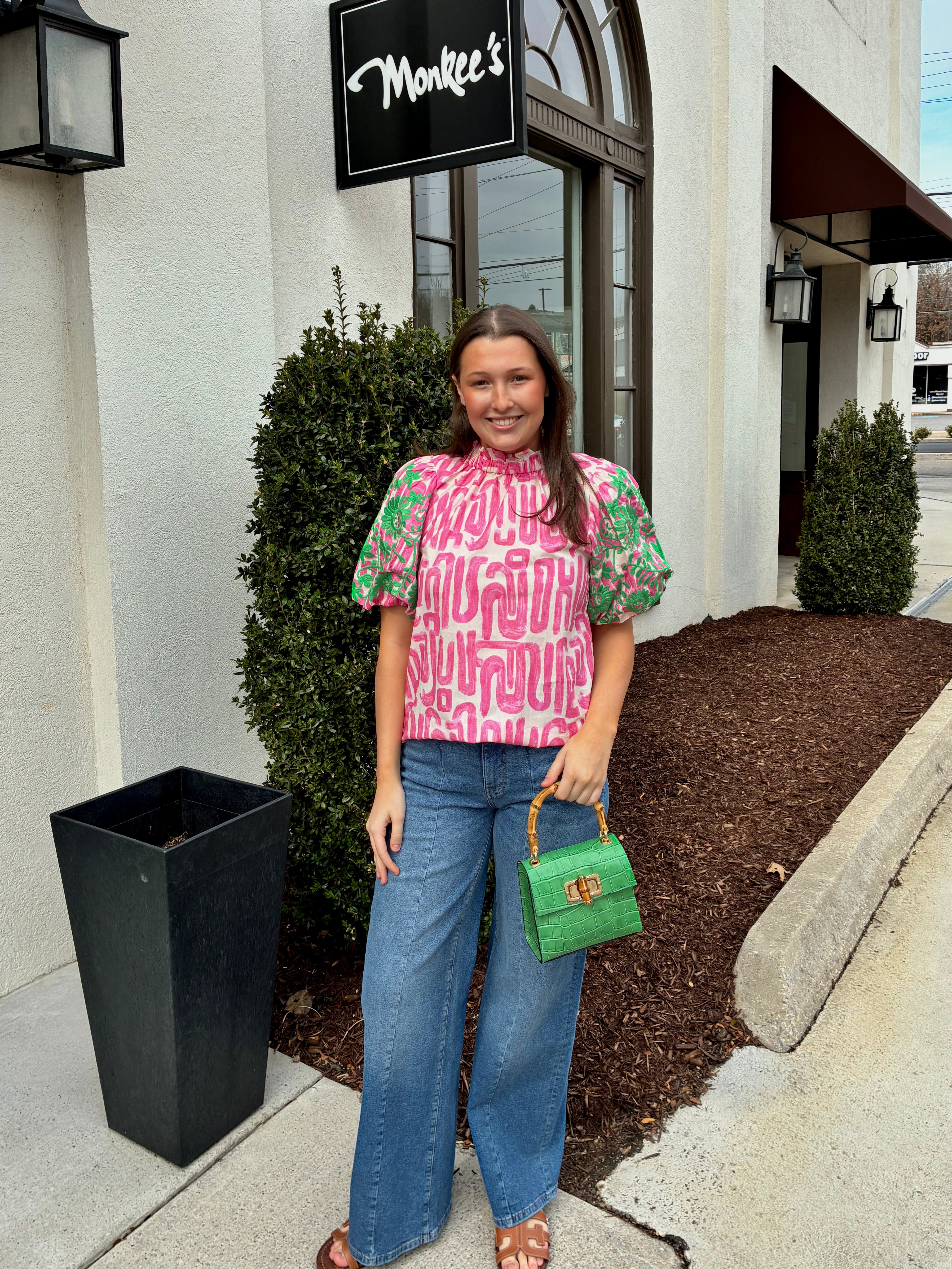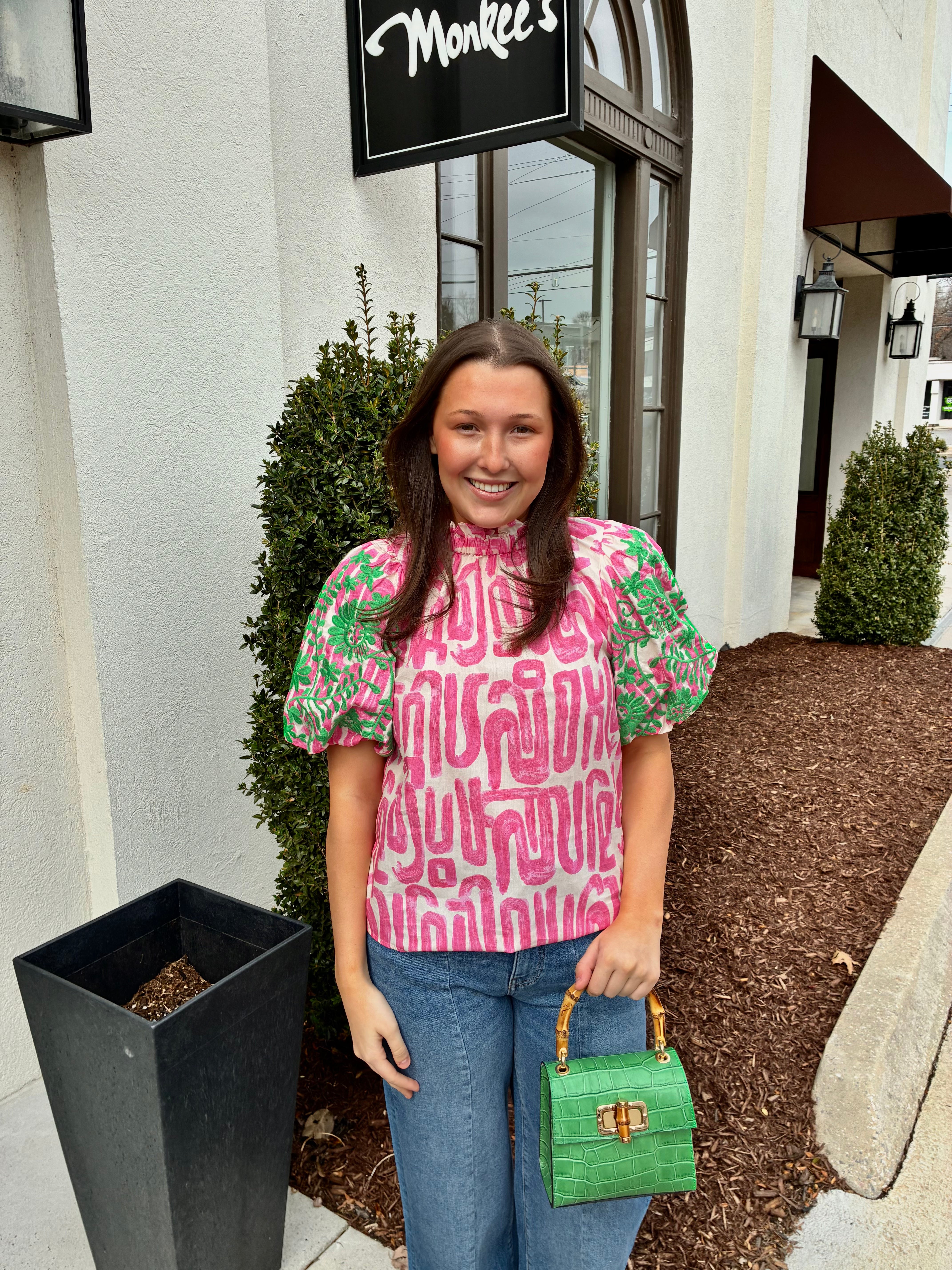 Embroidered Puff Sleeve Abstract Top in Pink