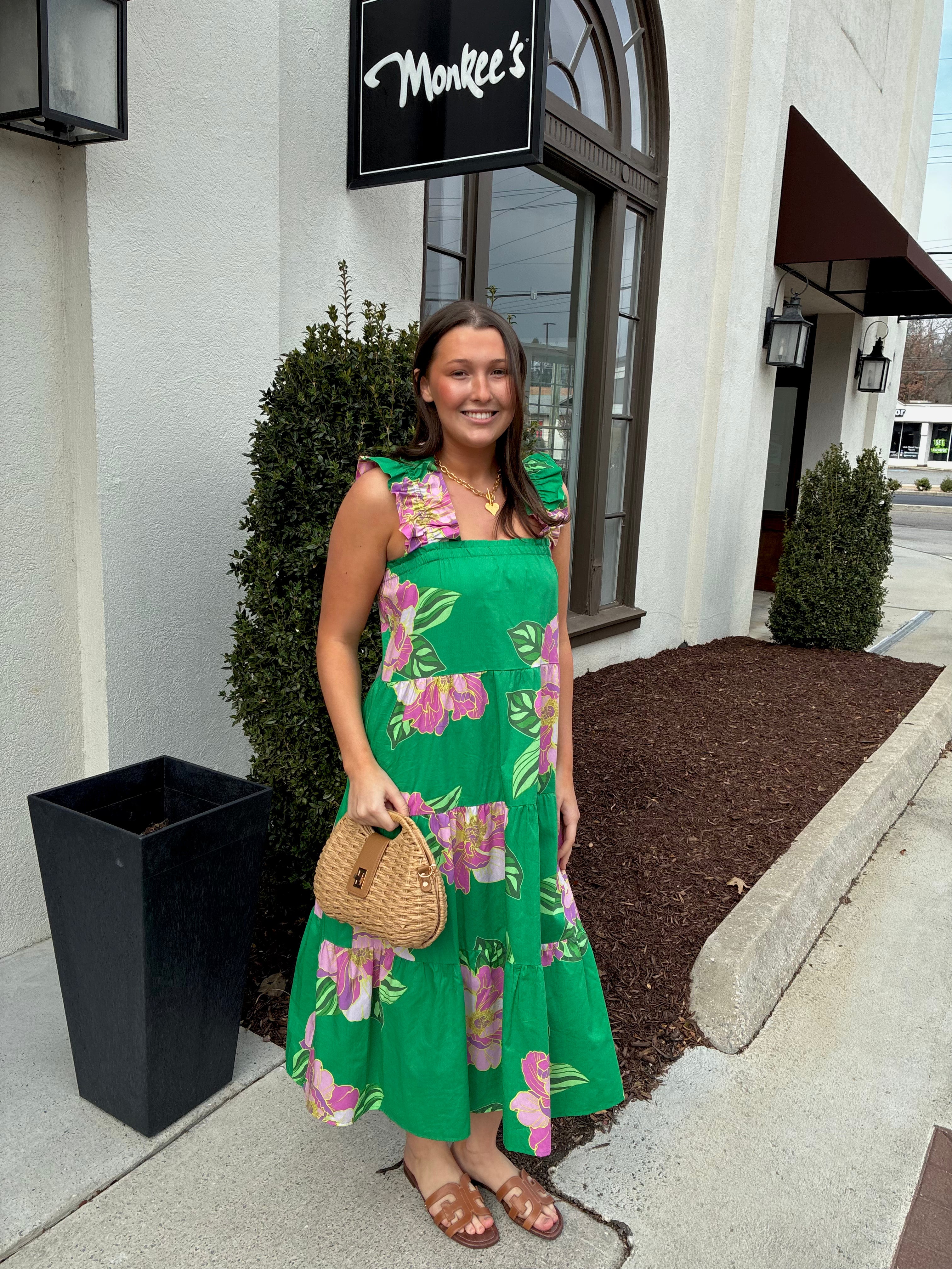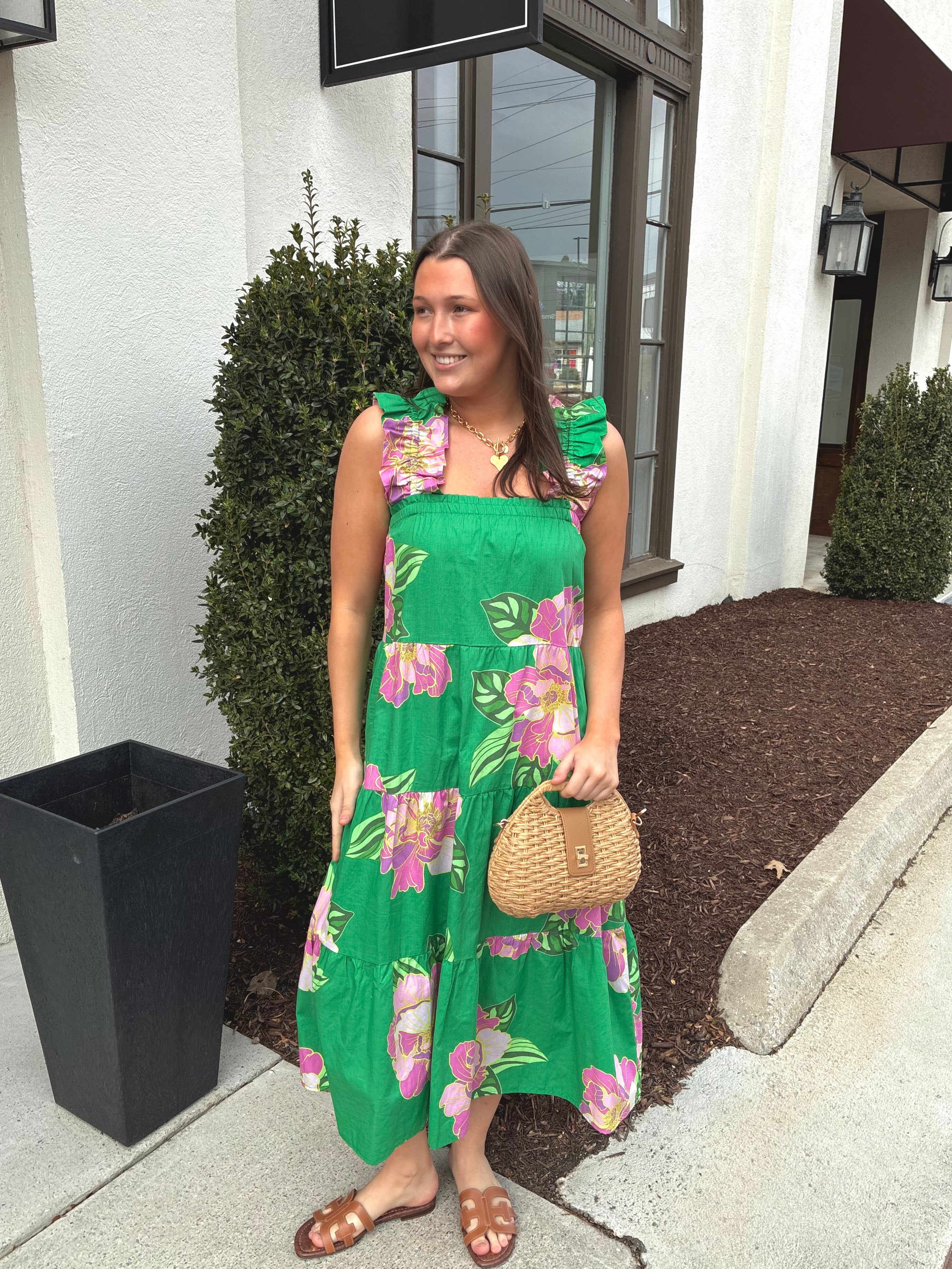 Floral Print Tiered Dress in Green