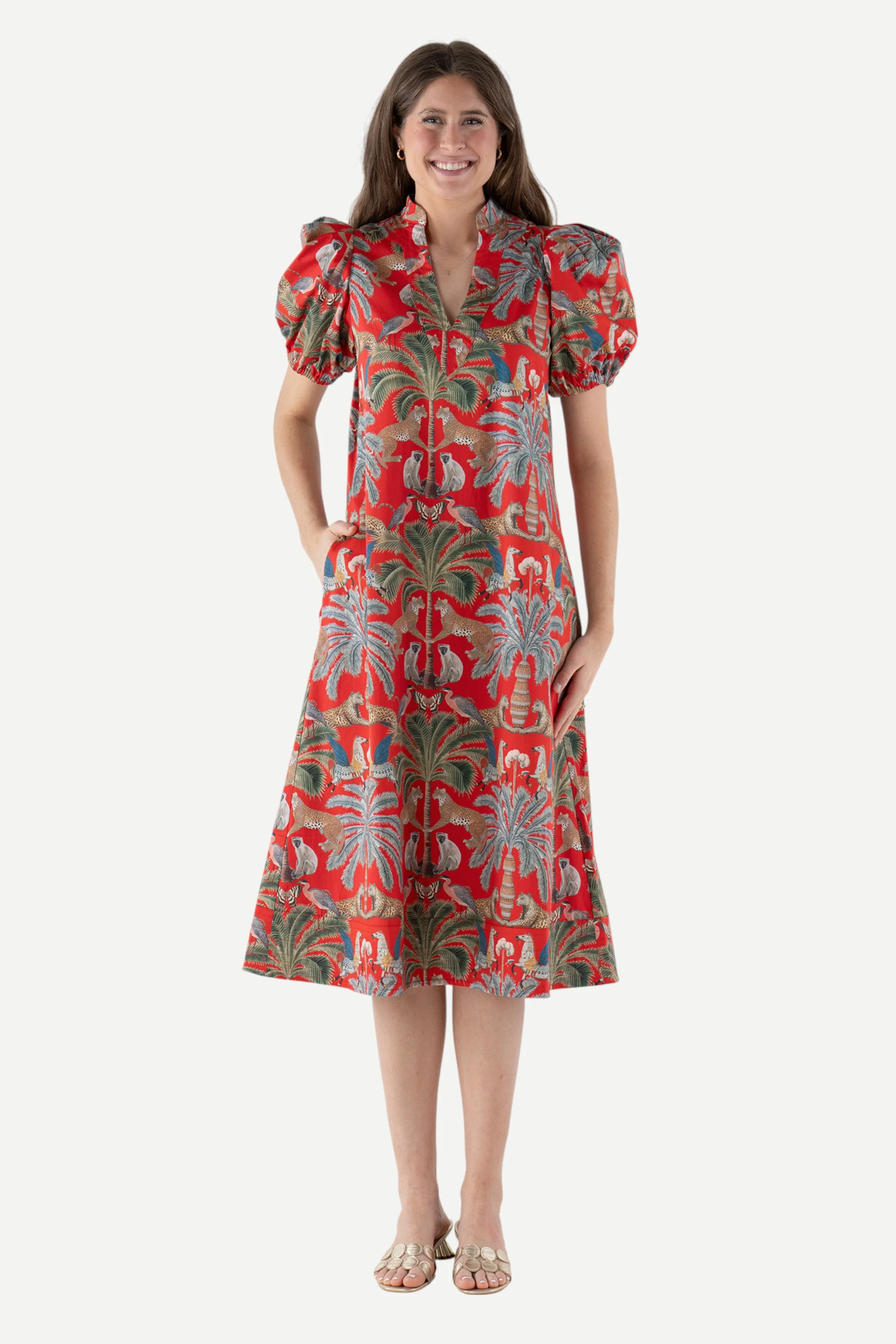 Effortlessly chic and full of personality, The Hampton Dress by Emily McCarthy is a statement piece you’ll reach for again and again. Created in an exclusive, vibrant print just for Monkee’s, this dress showcases a tropical-inspired design featuring lush palm trees and exotic animals in a stunning palette of red, green, blue, and soft neutrals.
