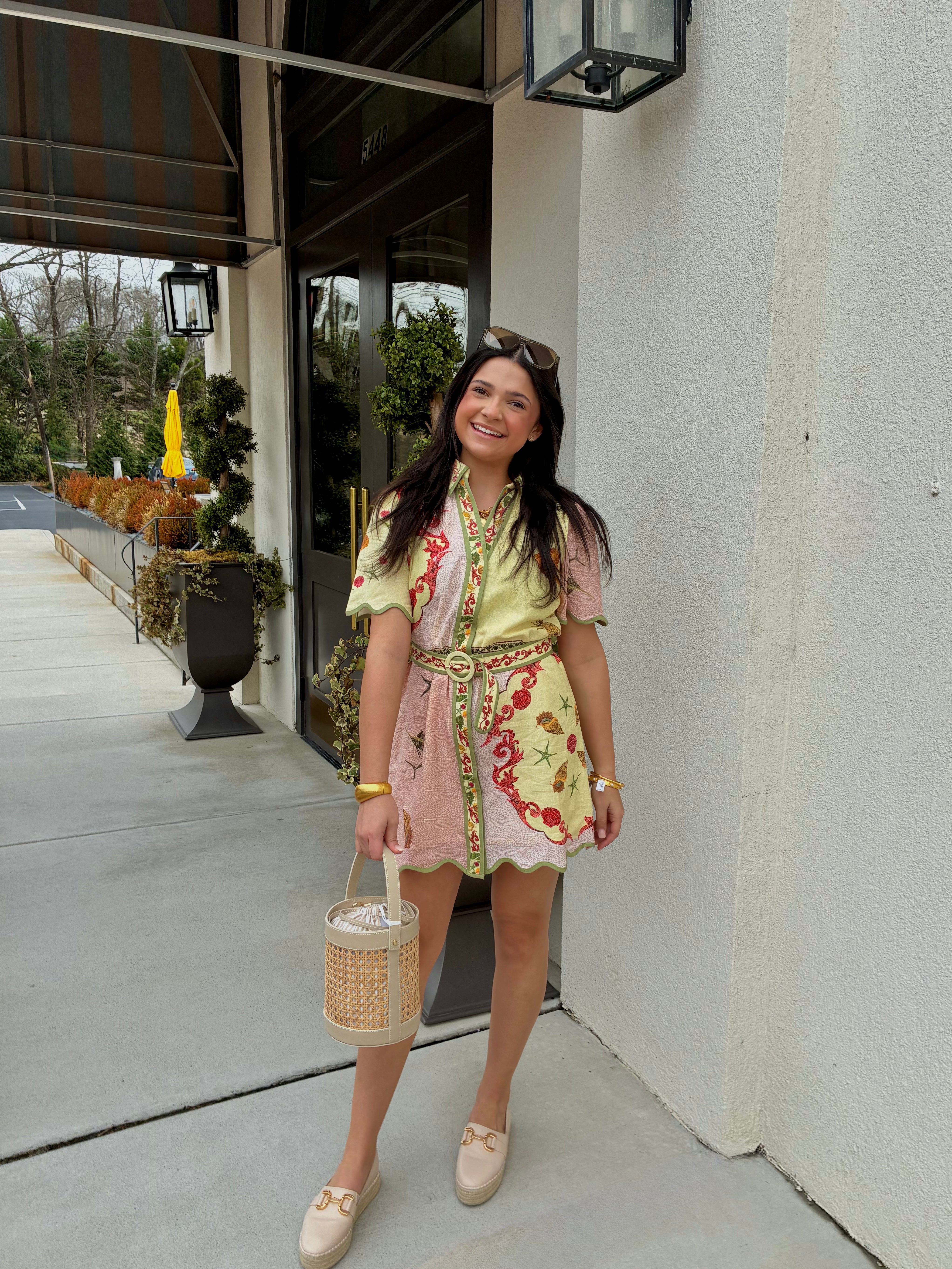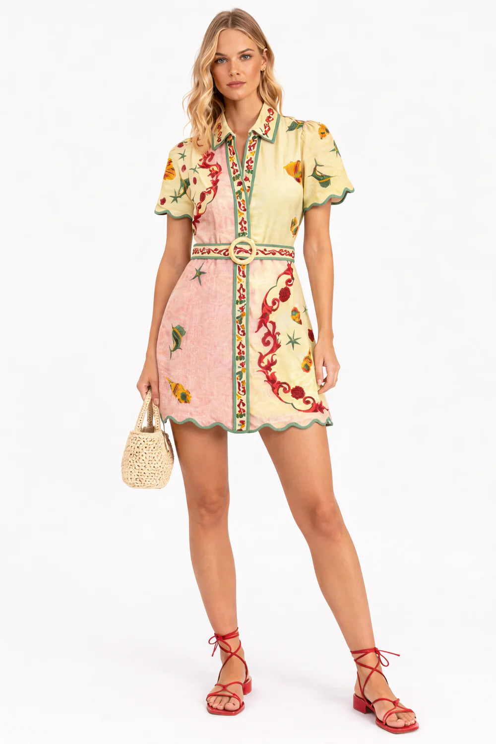 The Poppy Dress embodies sophistication with its short sleeves and a tailored collar. Featuring buttons that run the entire length of the dress and an optional belt to accentuate the waist, it offers versatile styling. The scalloped detailing adds an elegant, refined finish to this classic piece.