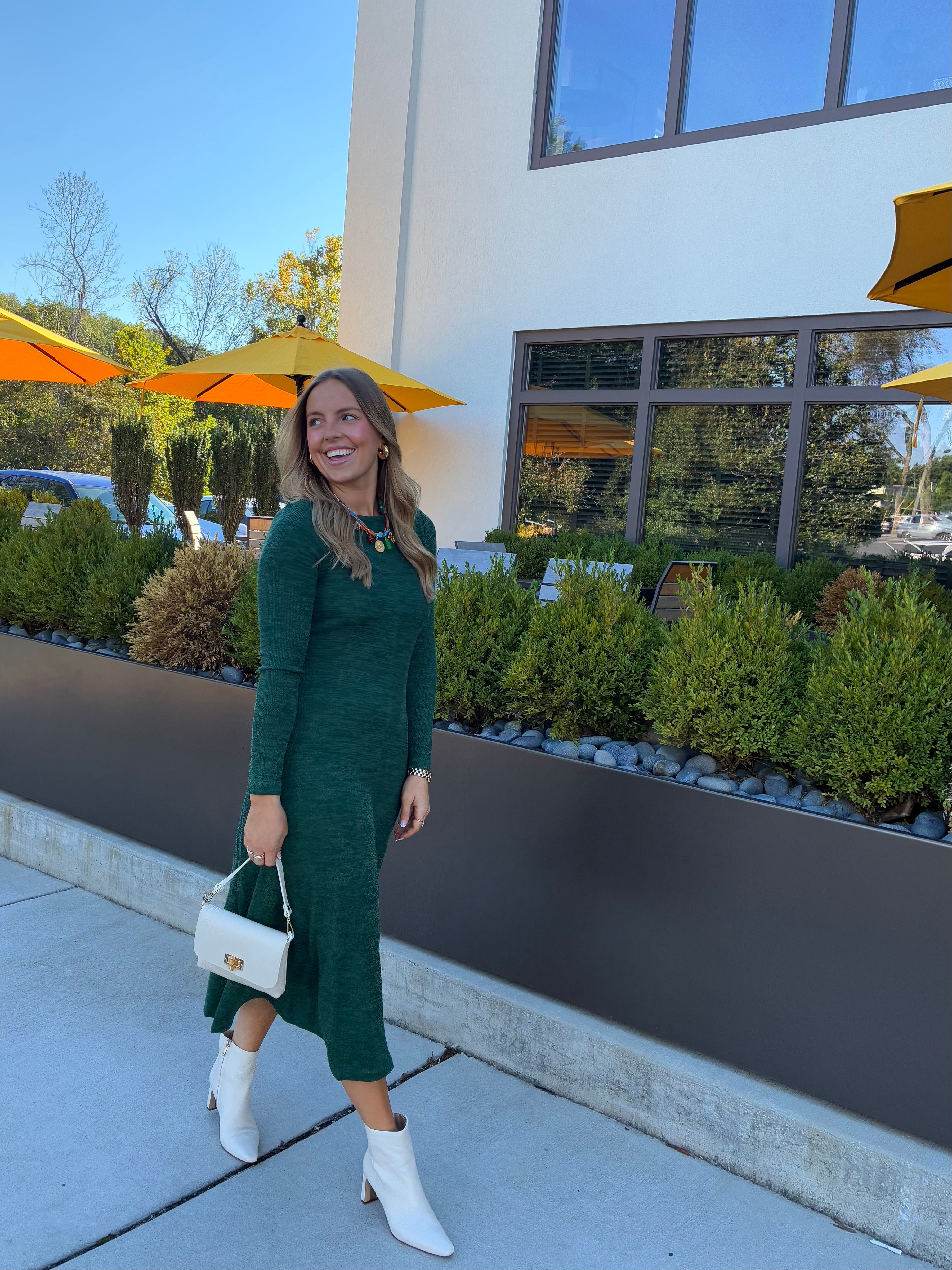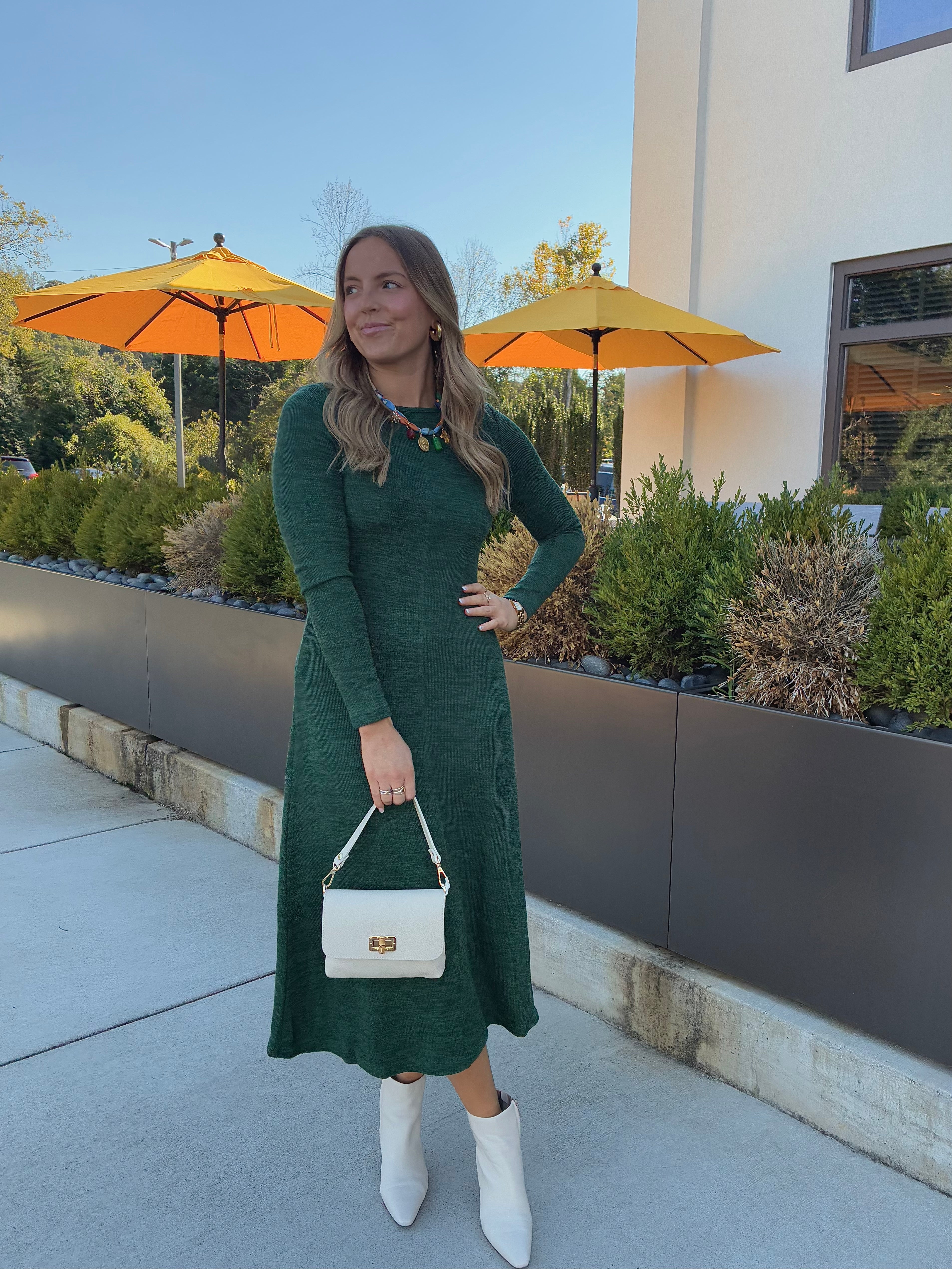 The Ribbed Knit Midi Dress in Green is a sleek and effortless statement piece. Crafted from a soft, stretchy ribbed knit, it offers a flattering, body-skimming fit that moves with you. The rich green hue adds a fresh pop of color, making it perfect for both casual days and dressed-up evenings.