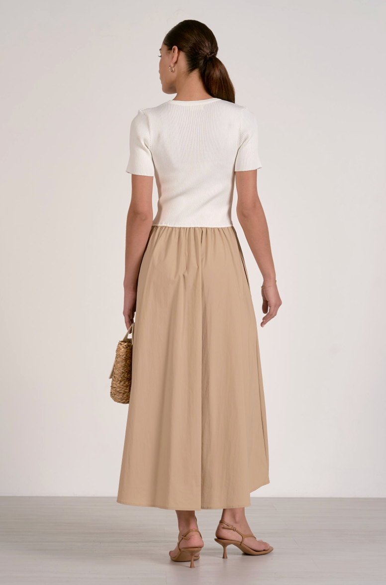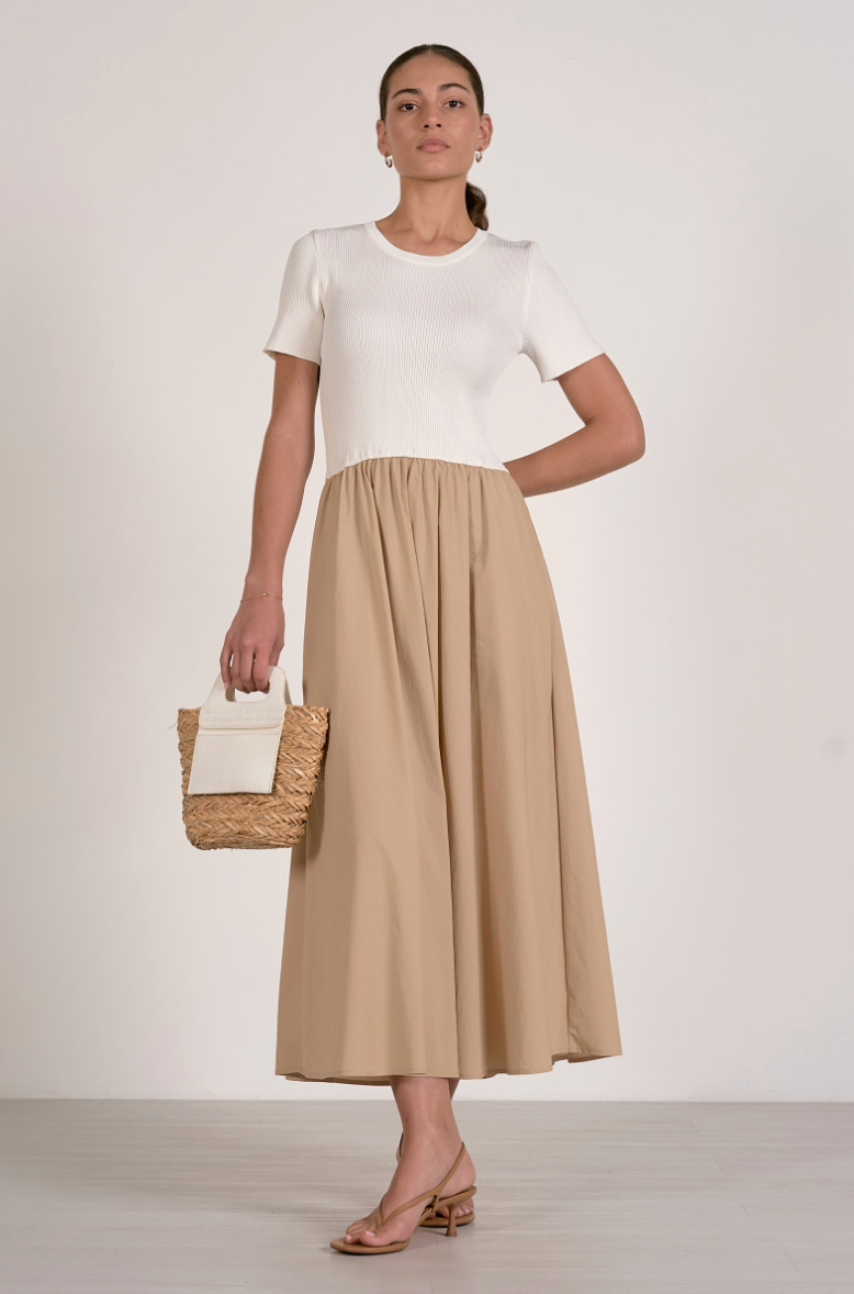 A modern essential with elevated texture, the Riley dress features pairs an eyelet-detailed knit bodice with a crisp pleated midi skirt. The short sleeves, crew neckline, and pockets offer ease and versatility, while the subtle eyelet pattern adds just the right touch of spring femininity. Effortless polish for everyday wear.