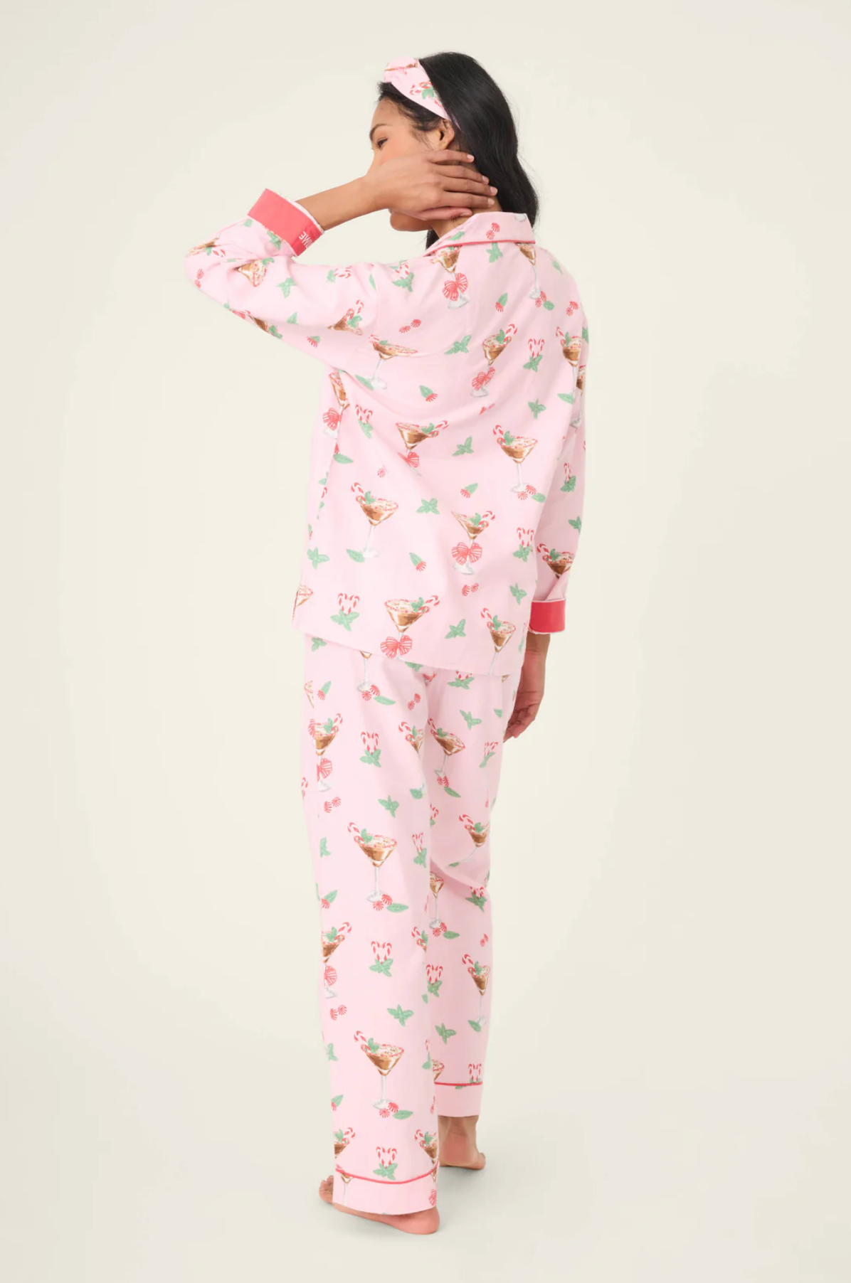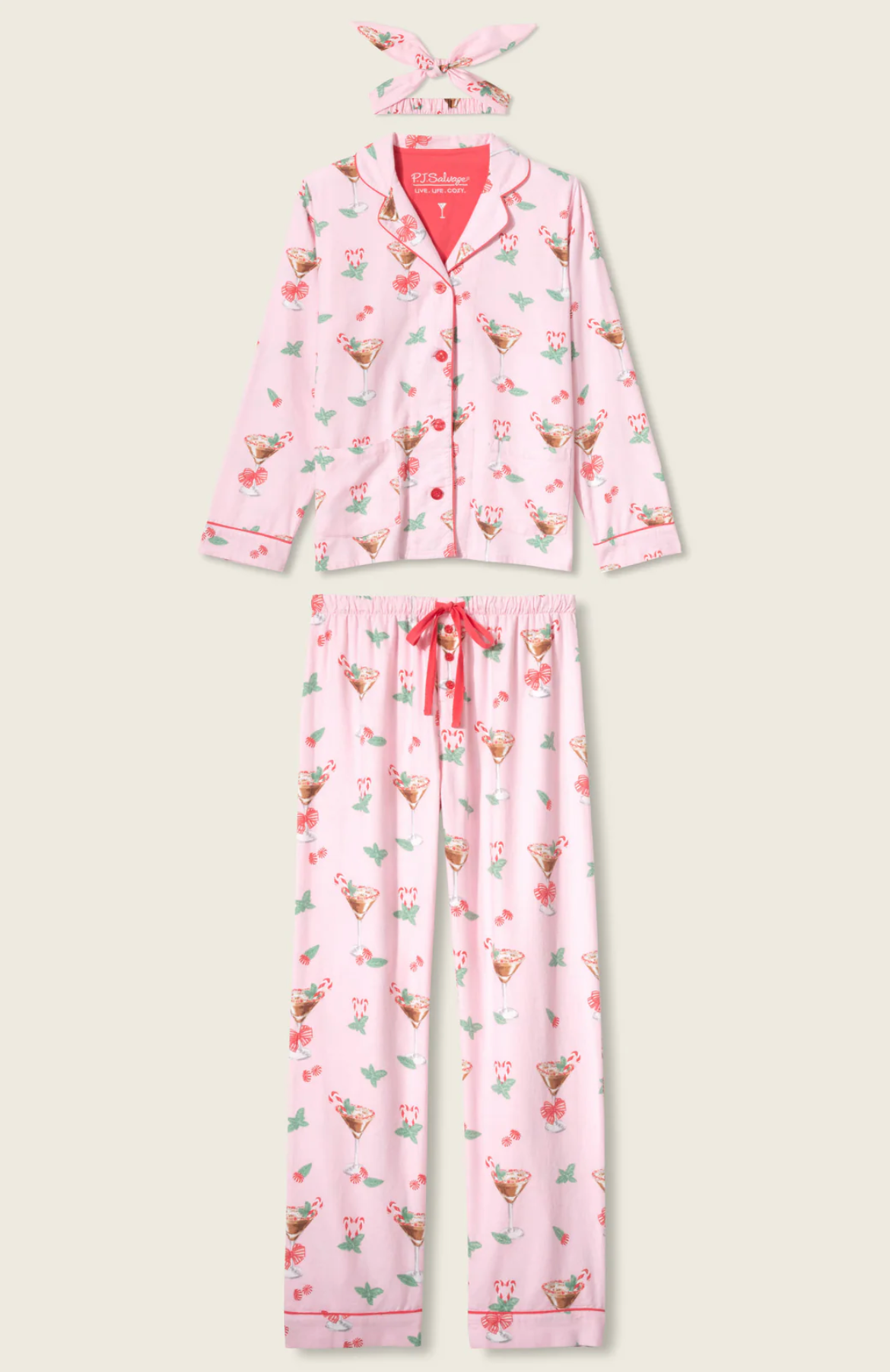 Festive and spirited, this three-piece flannel set is made from soft cotton in a classic twill weave, complete with a button-front top, relaxed drawstring pants, and a matching headband. The blush-pink backdrop is covered in candy cane martinis, mint sprigs, and cheery little bows, finished with contrast piping and a cuff that cheekily reads “Tini Time”—made for holiday happy hours, sweet nightcaps, and drifting off afterwards.