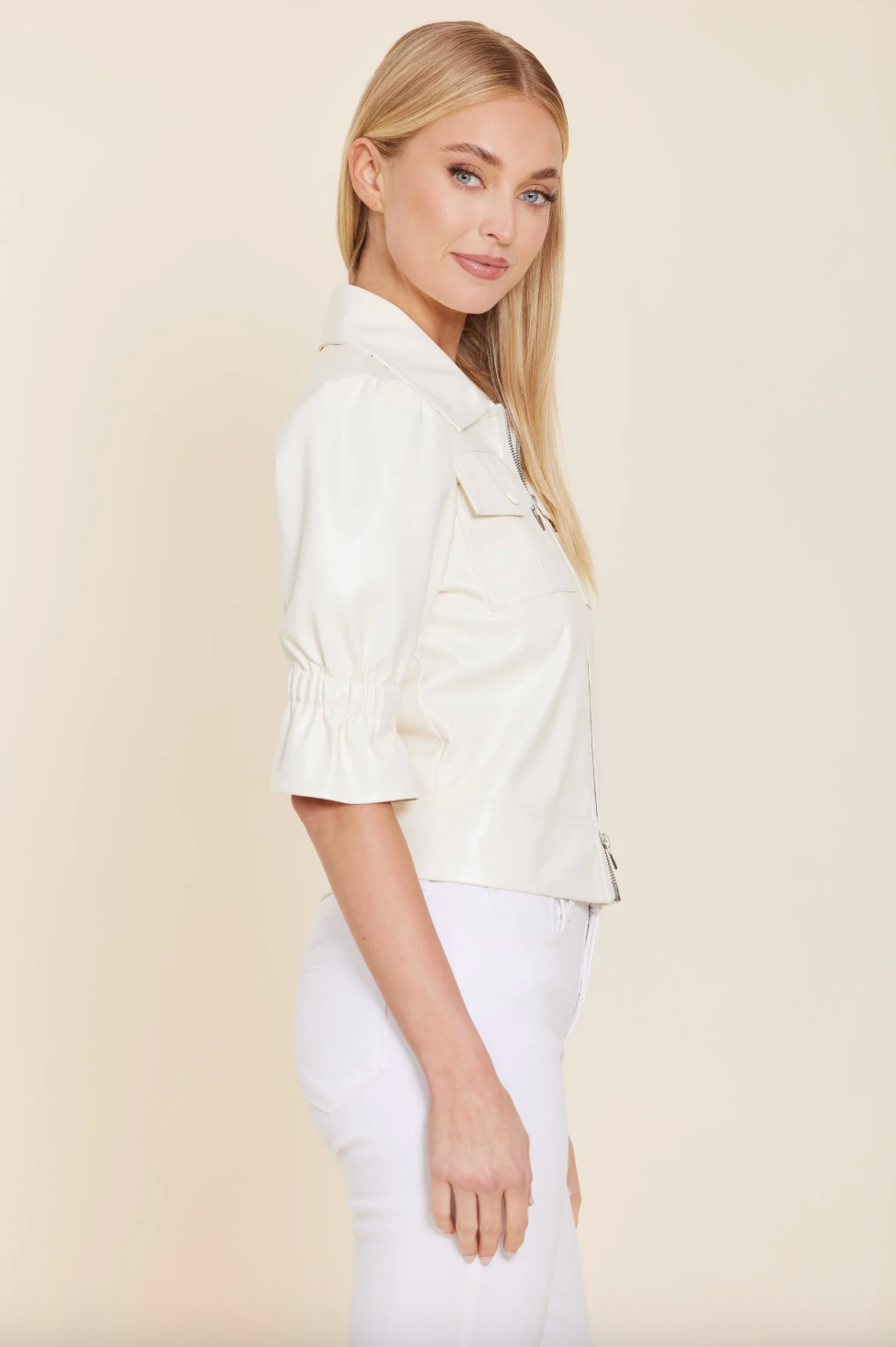 Faux Leather Short Sleeve Zip Jacket in Ivory