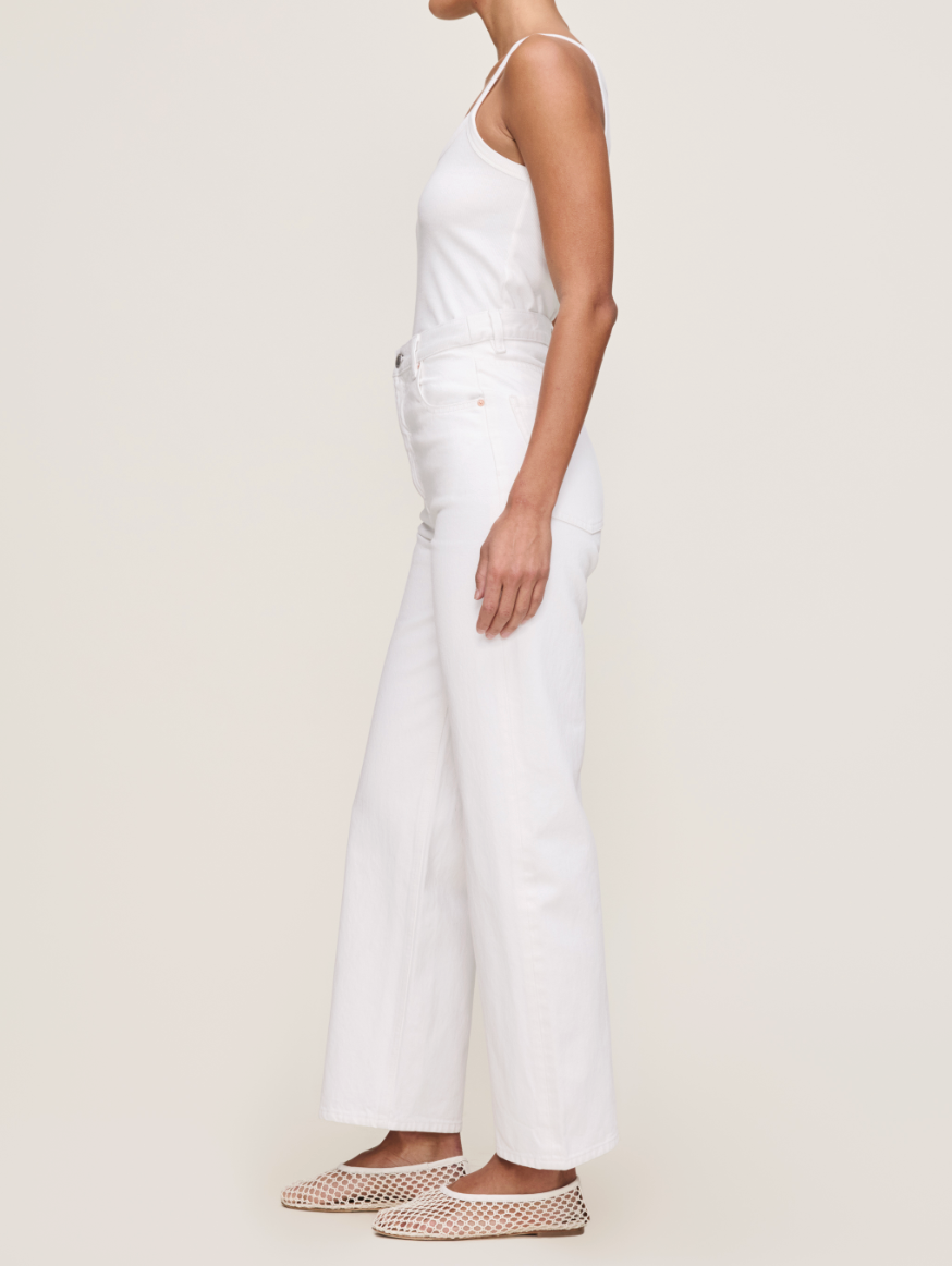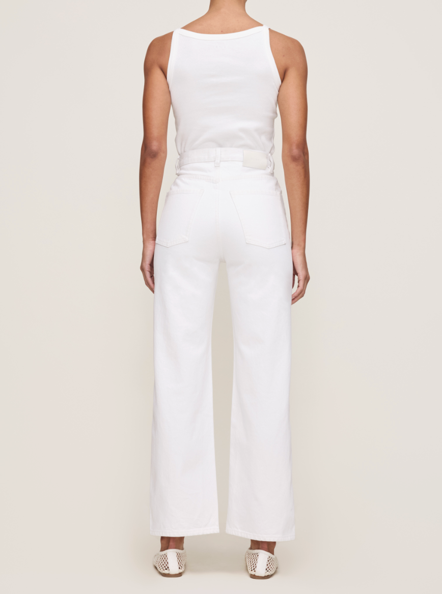 Flax is a warm, off-white denim. It features silver hardware, tonal stitching, a clean hem and an ecru back patch.