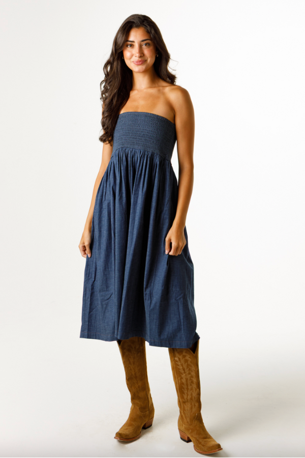 You asked for it and we did it, we made a SKIRT! This smocked waist skirt can be styled for your afternoon soirees or your party evenings. Midi length, wide smocked waist, pleats and stretch denim.