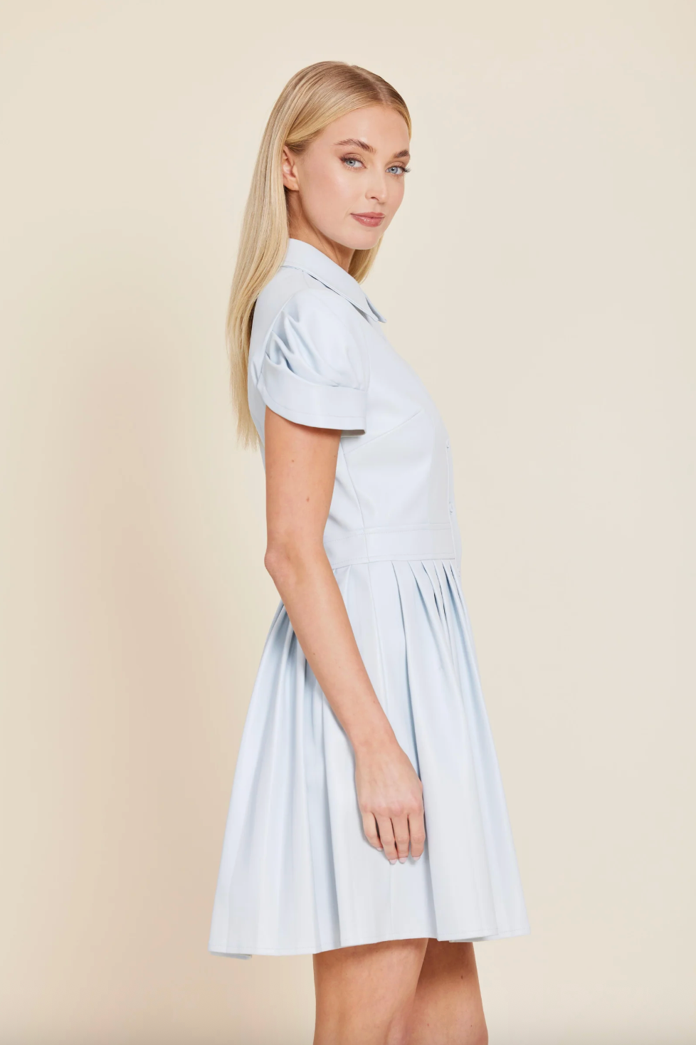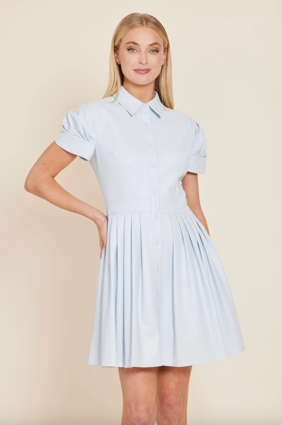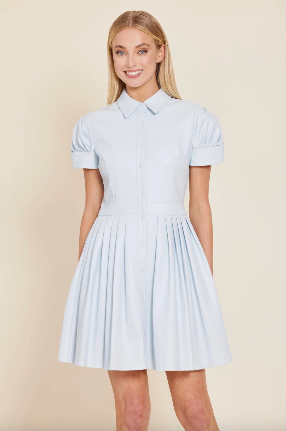 Softly structured with timeless feminine charm. This light blue faux leather mini dress features a classic collared neckline, elegant button-front detailing, and a beautifully pleated skate skirt for a flattering, refined silhouette. Crafted from smooth, lightweight faux leather, it offers polished structure with breathable comfort—perfect for spring and summer days. The fresh pastel blue hue makes it an elevated choice for Valentine’s Day outfits, Easter celebrations, brunch dates, and daytime events, delivering effortless elegance with a luxury finish.