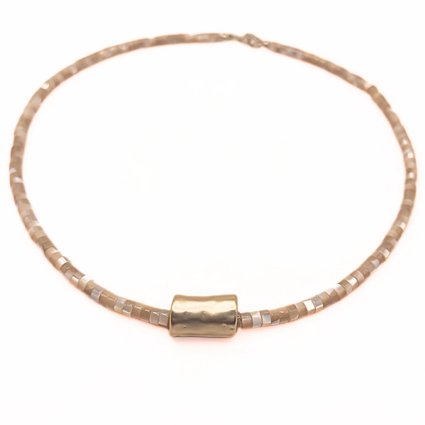 The Heishi Matte Gold Barrel Necklace features our classic matte gold barrel paired with natural Heishi beads in elegant neutral tones.