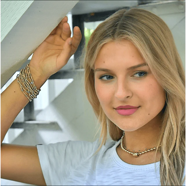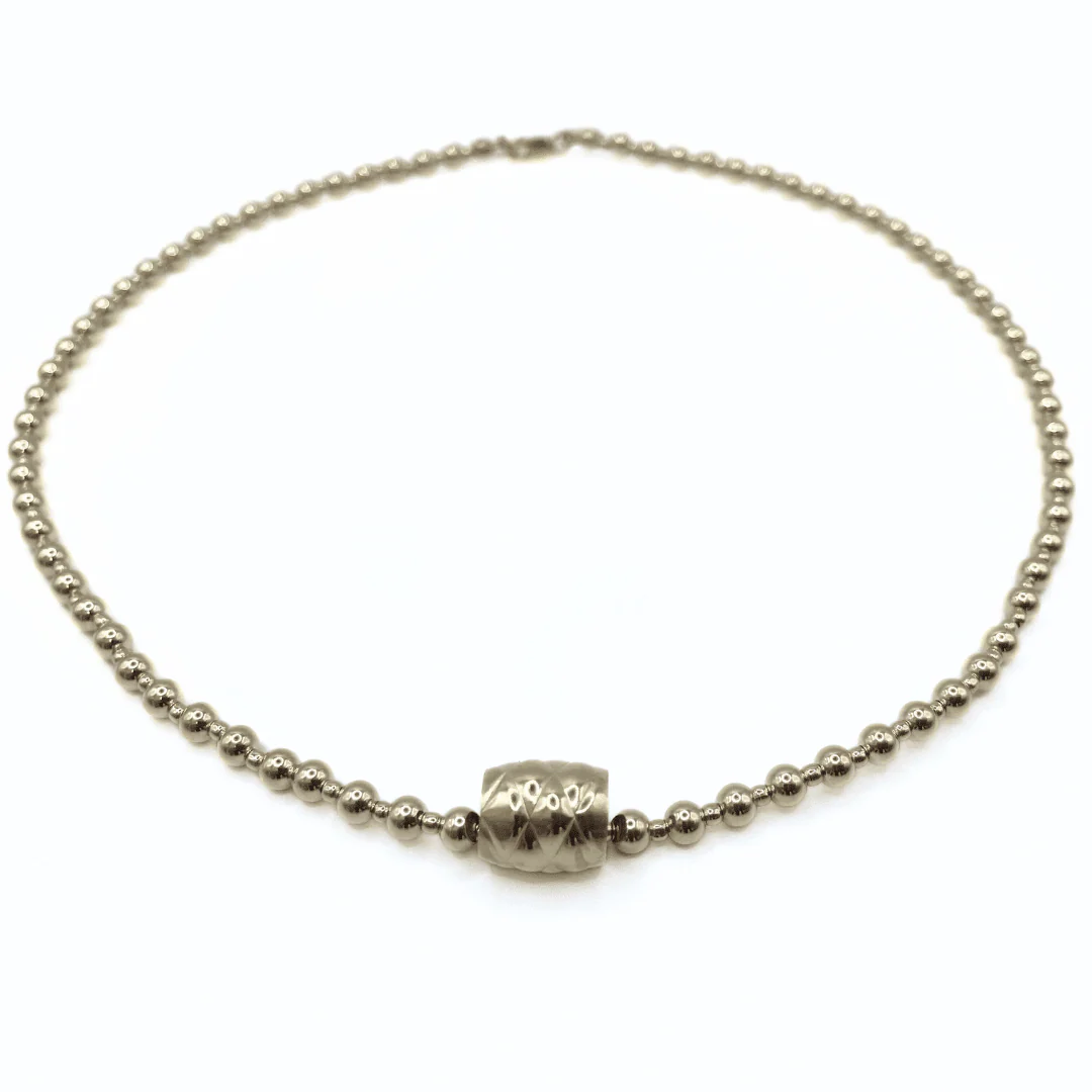 This 14k gold-filled necklace features a stylish combination of 4mm and 2mm beads paired with our signature gold-filled barrel clasp. Part of the popular erin gray barrel necklace collection, it offers lasting beauty and durability. Waterproof and tarnish-resistant, this 16-inch chain is perfect for everyday wear.