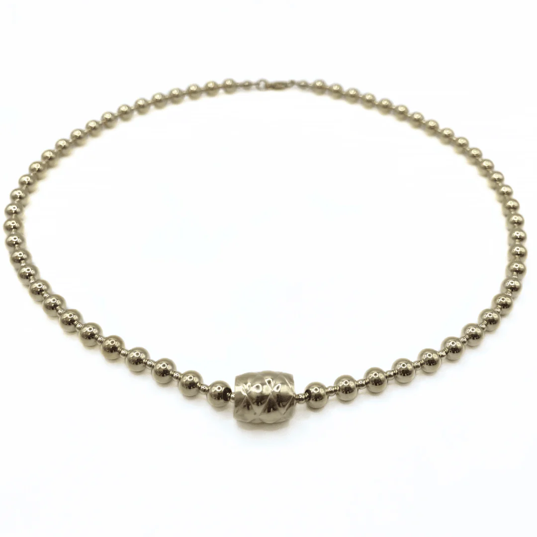 This 16-inch necklace features 5mm and 2mm 14k gold-filled beads paired with our iconic gold-filled barrel clasp. A standout piece from the beloved erin gray barrel necklace collection, it’s designed to resist tarnishing and is fully waterproof, ensuring lasting beauty and durability. Perfect for everyday wear with timeless elegance.
