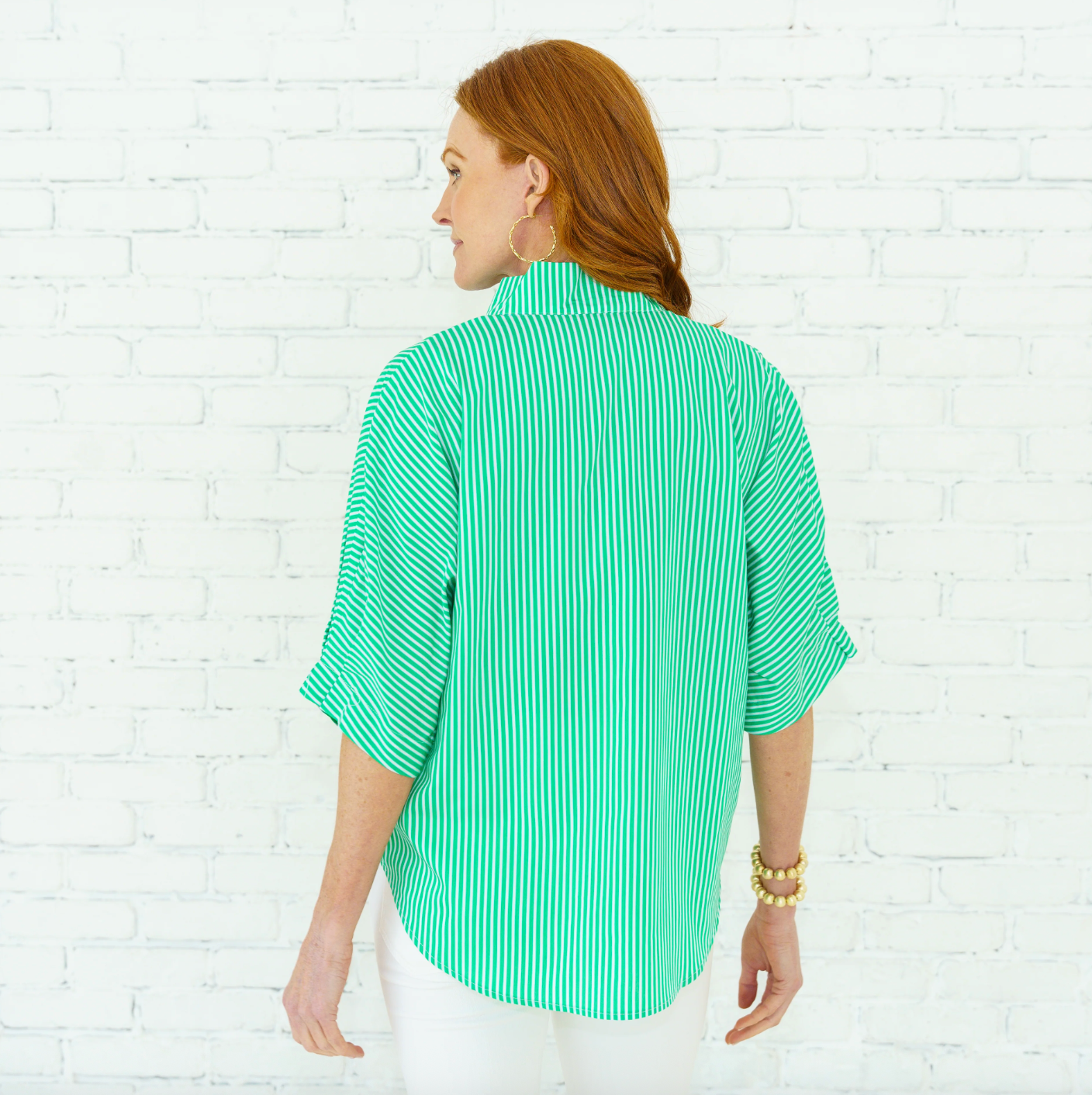The Annie Stripe Top is the perfect balance of flowy comfort and polished style. Designed with a flattering notch collar and beautiful pleated sleeve detail, this easy silhouette gives you an elevated look without sacrificing wearability. The shirt-tail hem is thoughtfully designed to cover in all the right places, making it effortless to style with denim, trousers, or your favorite everyday bottoms.