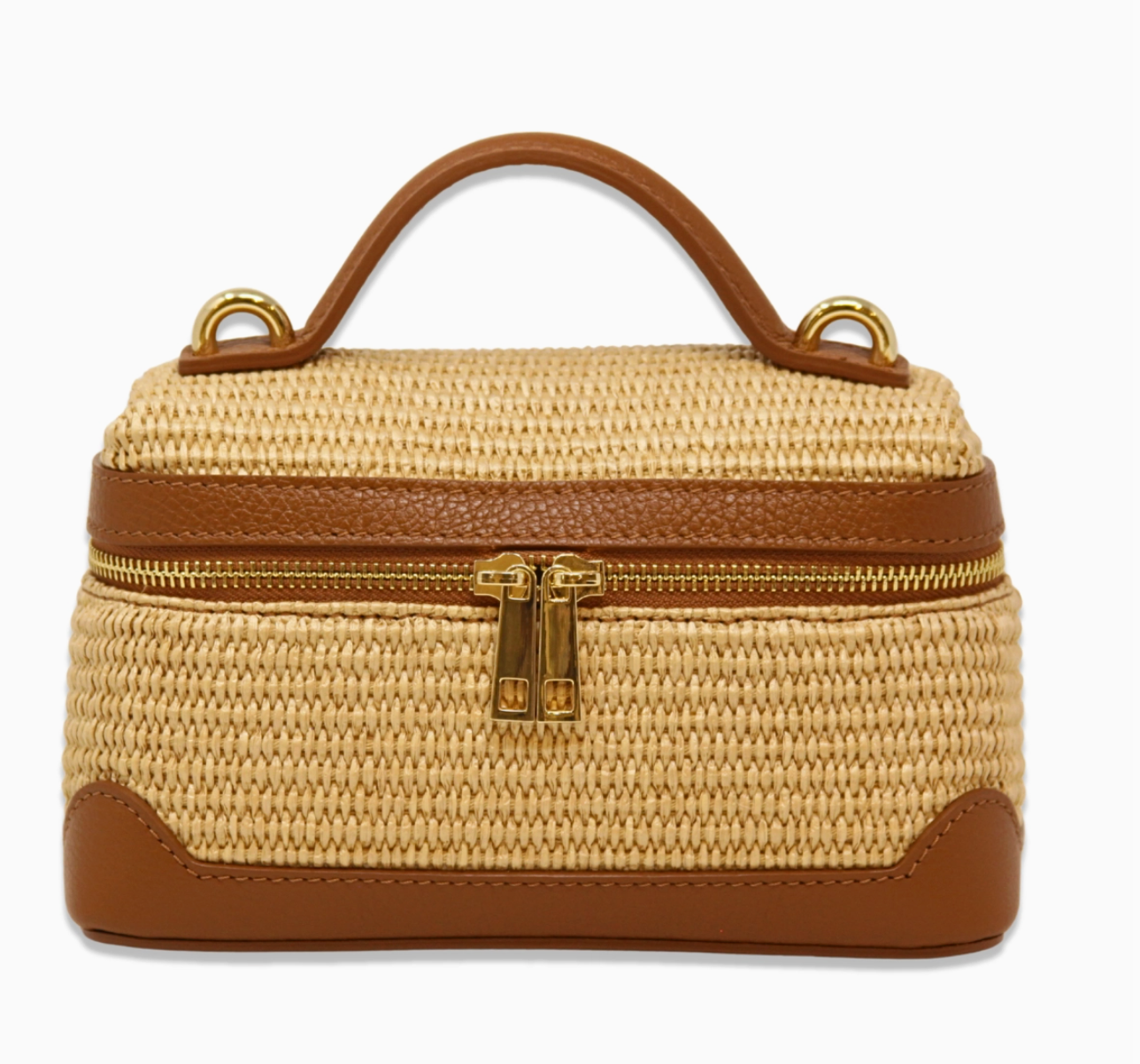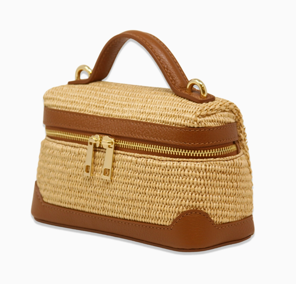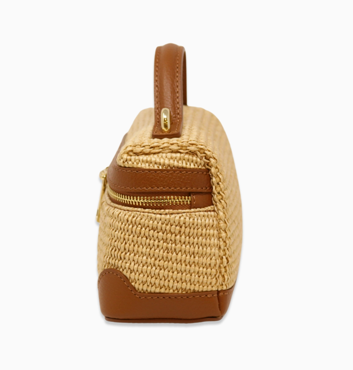 Effortlessly chic and designed for warm-weather days and blends natural texture with polished details for a refined coastal look. Crafted with a structured woven exterior and finished with smooth leather trim, this bag features a clean rectangular silhouette that feels both relaxed and sophisticated.