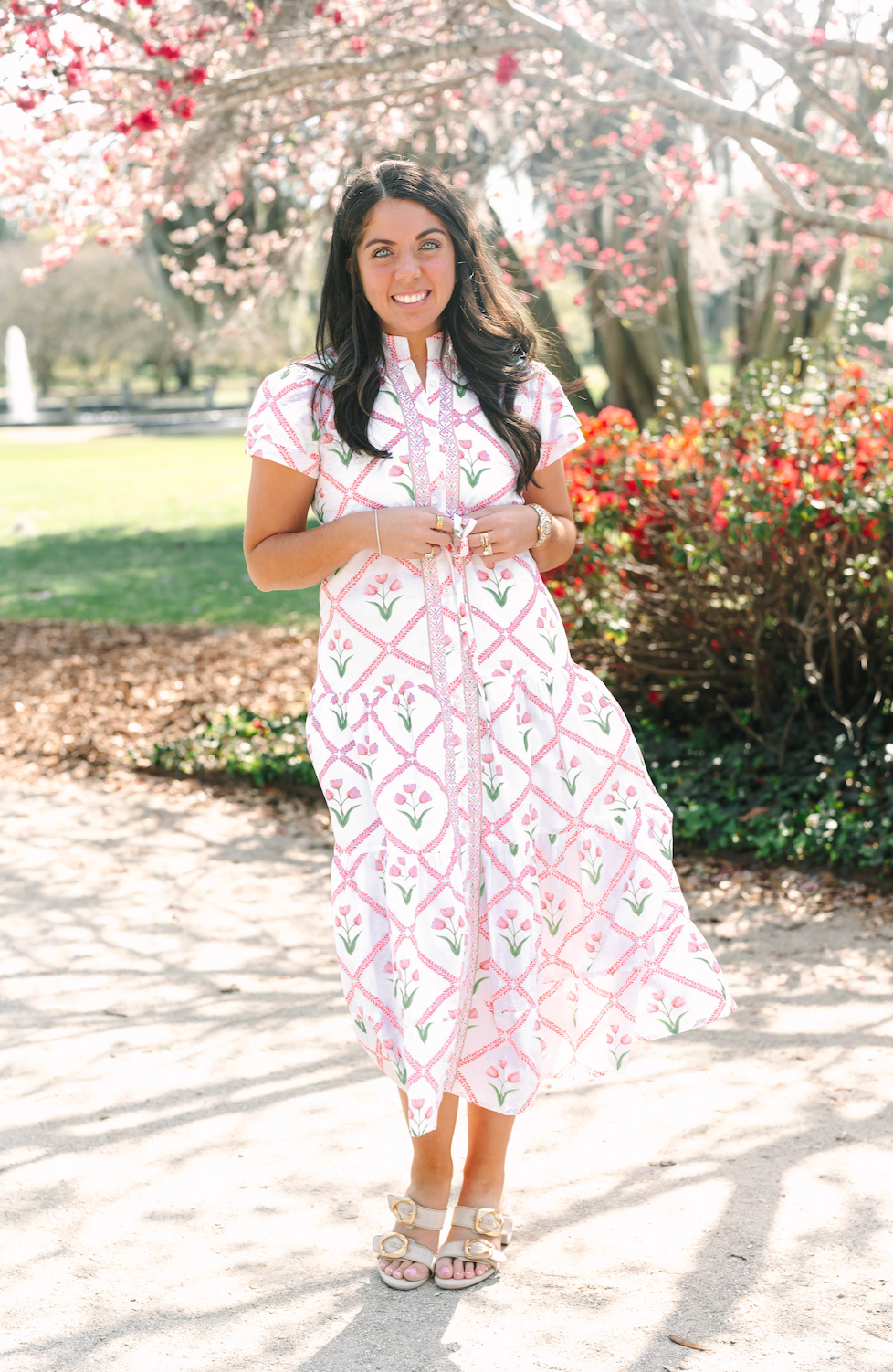 Our Magnolia Flutter Dress was designed after Magnolia Gardens in Charleston. It features a drawstring waist, four-tiered skirts, top-to-bottom contrasting trim, and buttons going upwards from the bottom of the dress to the bust.
