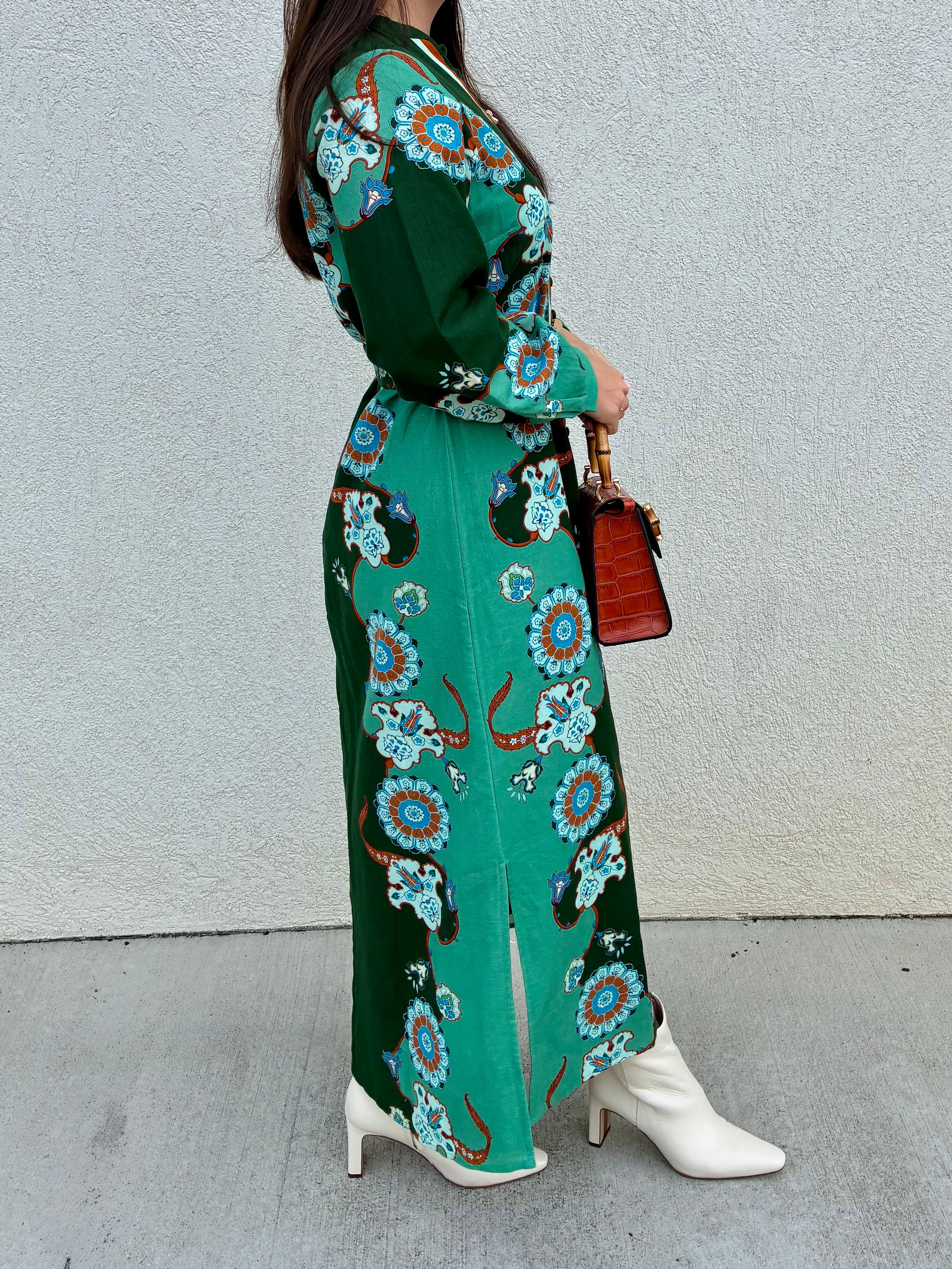 The Riley Caftan features a refined V-neck silhouette and an optional tie belt, offering a versatile fit for any occasion. Perfect for everyday wear or elevating your game day ensemble, it blends effortless style with comfortable elegance.