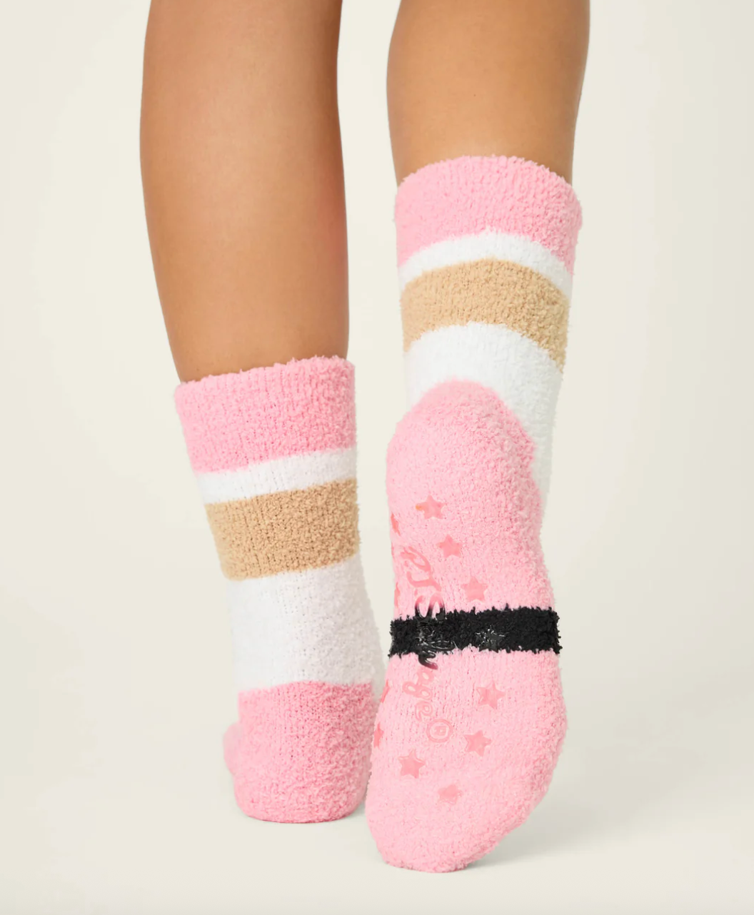 Snuggle into the holiday season with these pink fuzzy socks, topped with a Santa face, pom-pom hat, and black belt graphic. Finished with gripper bottoms, they’re a jolly pair made for cozy lounging, gifting, and festive mornings.