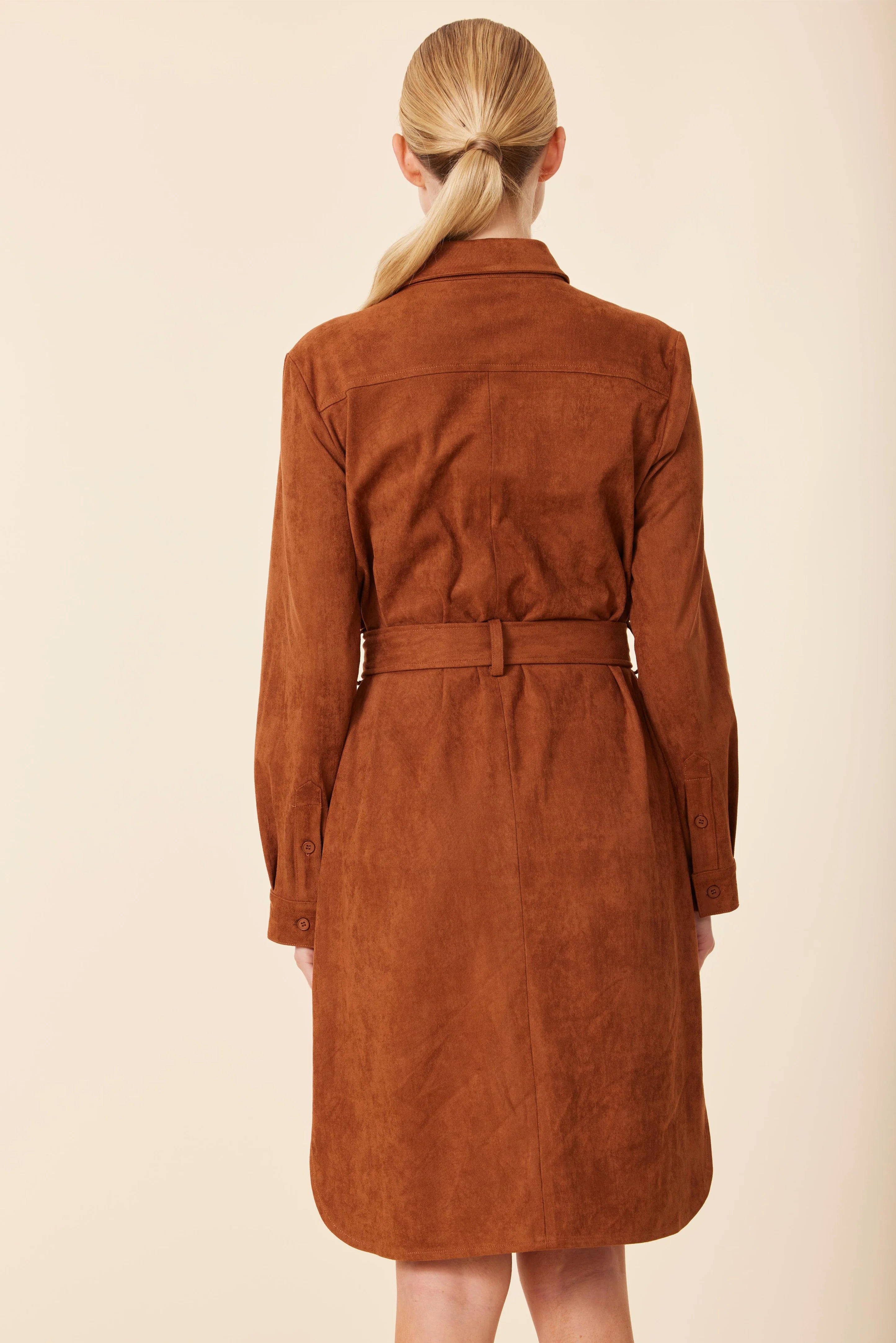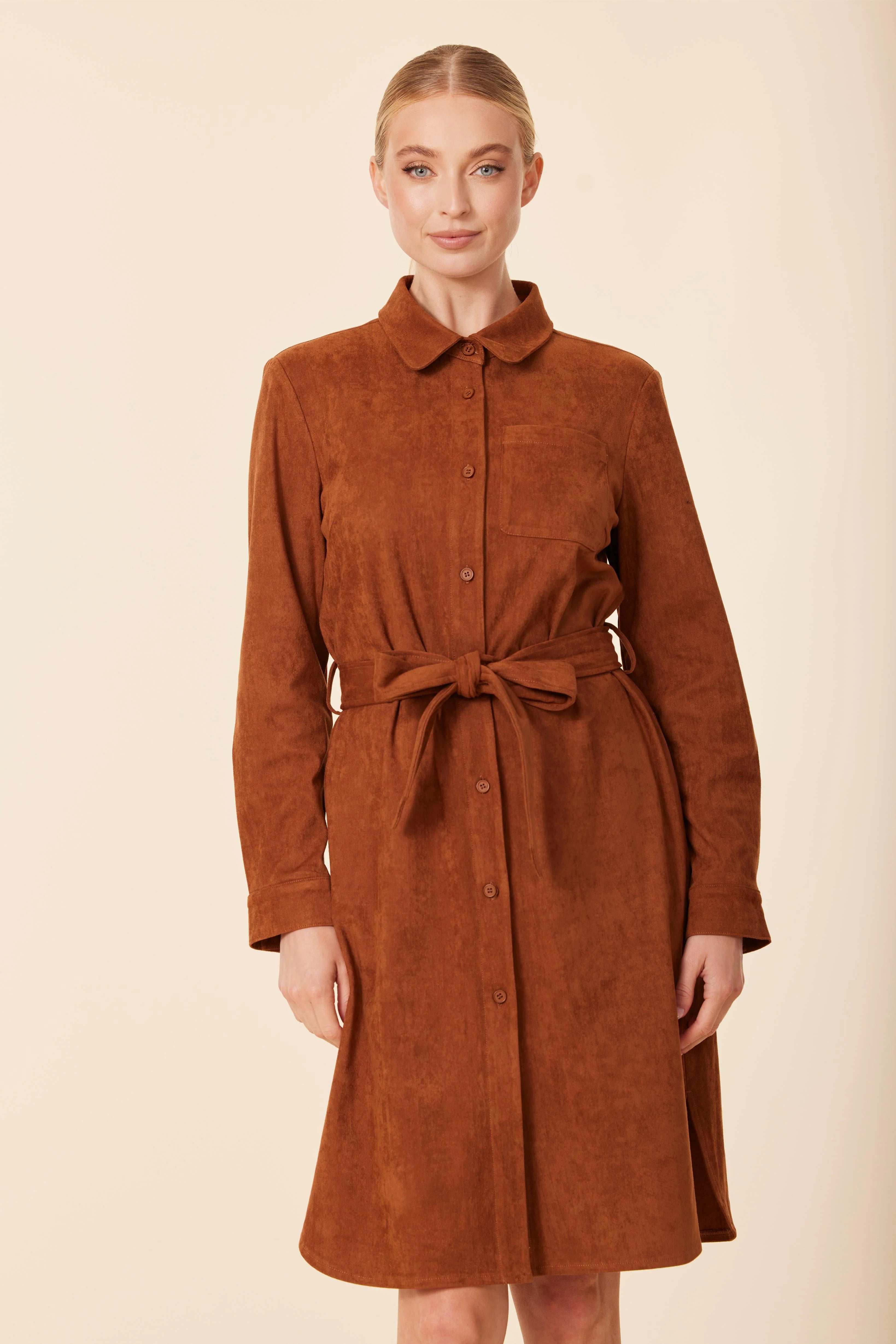 The Faux Suede Belted Dress in Rust brings effortless sophistication with a touch of autumn charm. Crafted from ultra-soft faux suede, this dress offers a flattering fit enhanced by a matching belt that defines the waist beautifully. The rich rust hue adds warmth and depth, making it perfect for the season. Dress it up with boots or heels for an elevated fall look that transitions seamlessly from day to night.