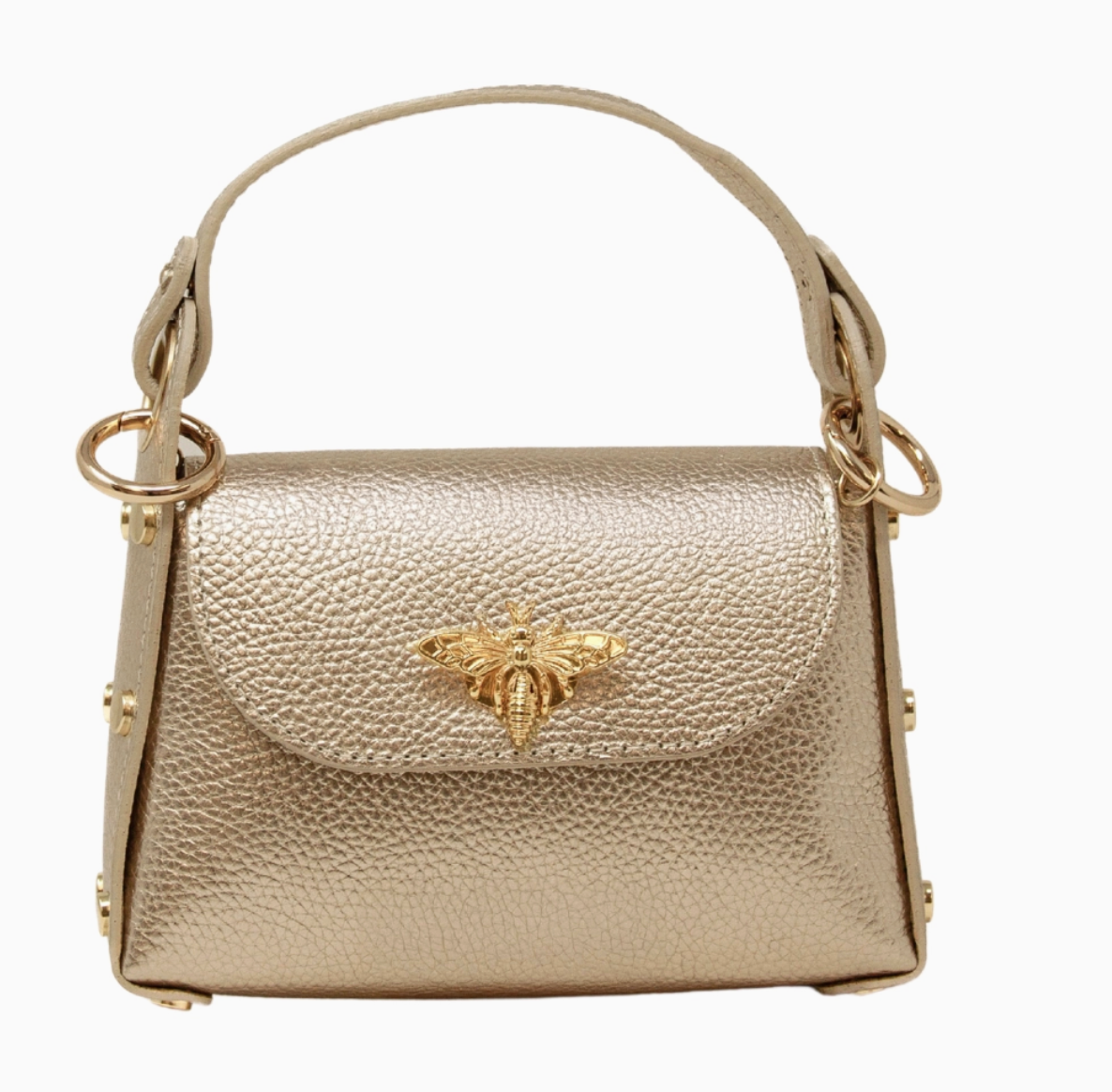 The Leather Bee Mini Bag is a stylish designer handbag made from premium leather. It features an eye-catching butterfly logo on the front that sets it apart. Inside, you'll find a spacious main compartment secured with a zip closure, along with a long shoulder chain for effortless carrying. Measurements: 7''W x 5''H x 2.5''D