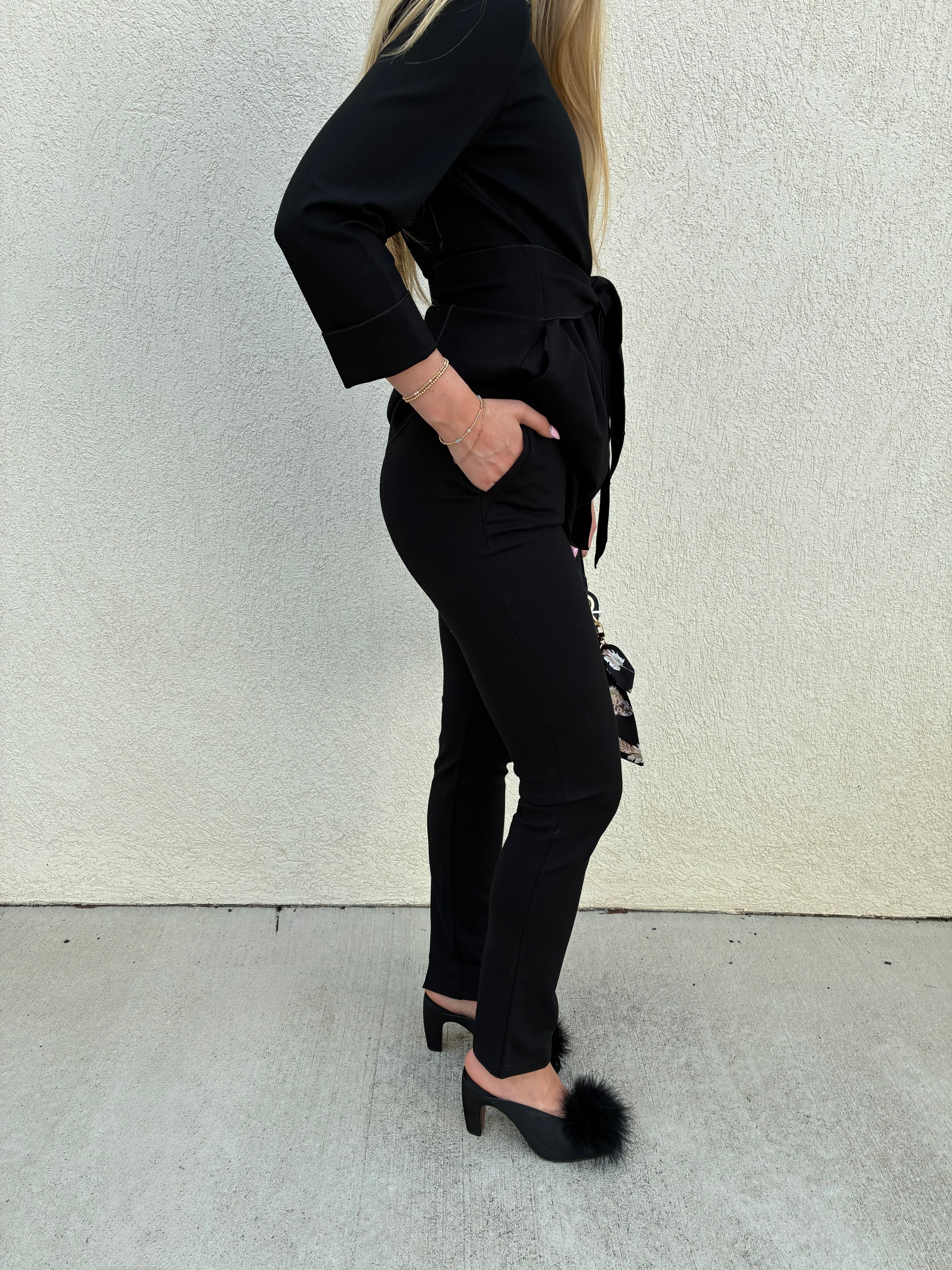 The Knit Pant in Black is a wardrobe staple designed with comfort and versatility in mind. Crafted from a soft knit fabric, these pants feature a sleek, streamlined silhouette that’s both flattering and easy to wear. The classic black hue makes them endlessly adaptable—perfect for pairing with sweaters, blouses, or the matching Knit Jacket in Black for a chic, coordinated look. Whether styled casually or dressed up, these pants are an effortless go-to.