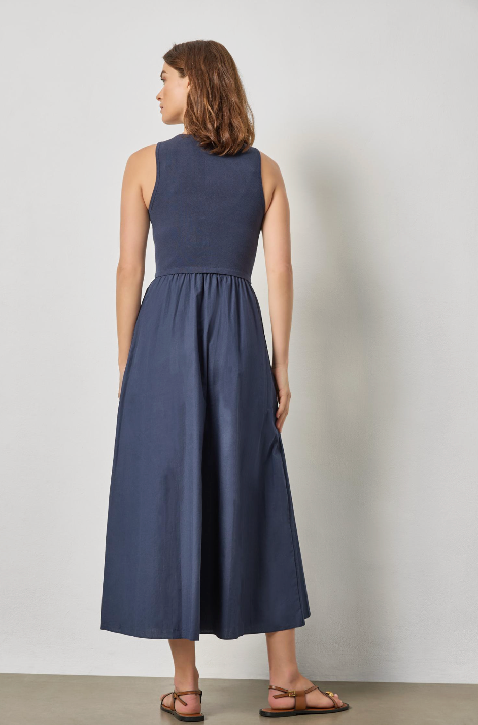 Intricate stitch details and a classic scoop neckline give a classic feel. The attached poplin skirt is crisp and looks beautiful with the knit. Whether worn with sandals, sneakers, or heels, it's an easy go-to for any occasion. Available in four color combinations.