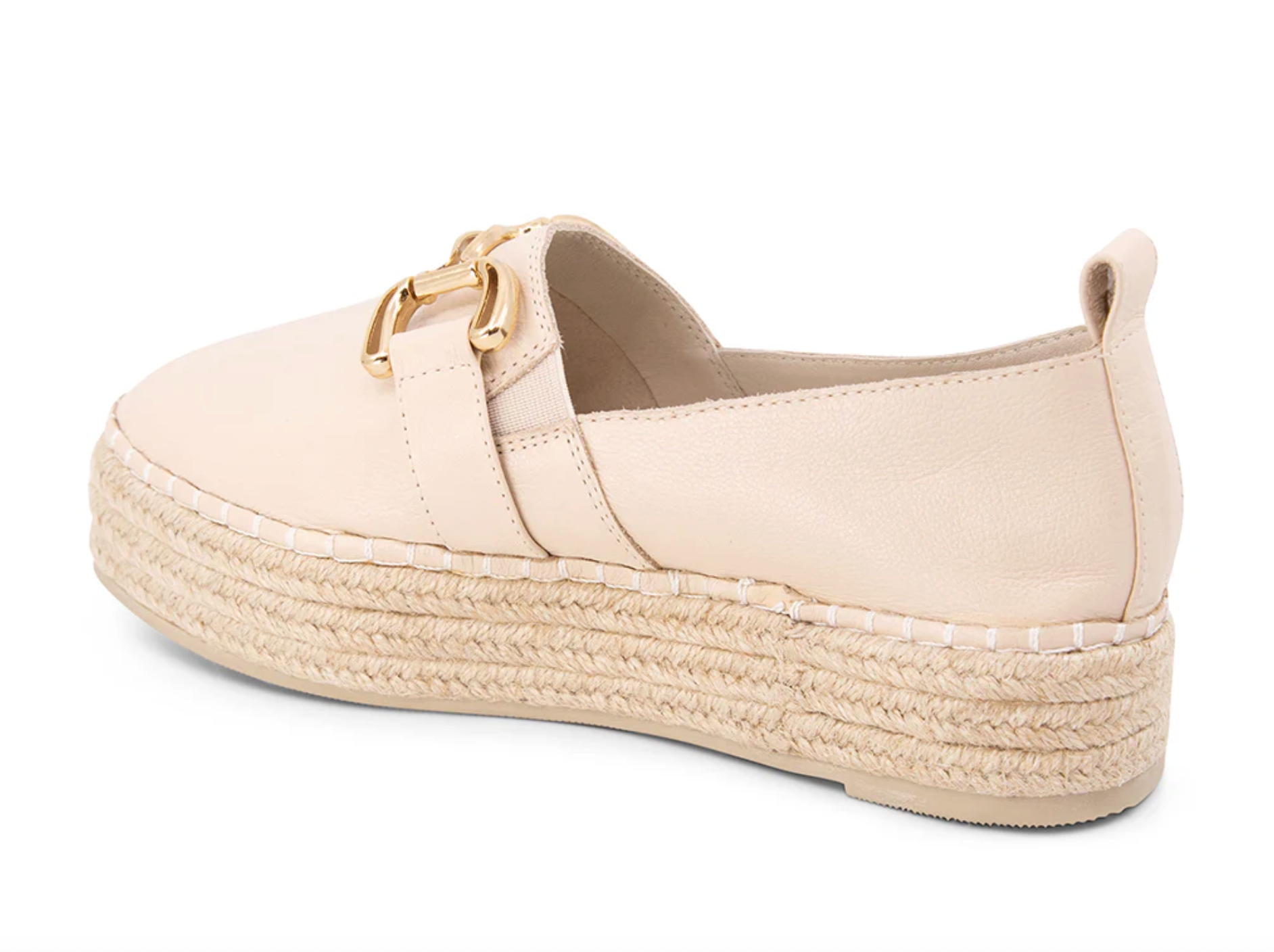 Effortlessly polished with a modern edge, this chic espadrille platform shoe brings elevated ease to everyday dressing. Designed in a soft leather, this slip-on shoe features a clean upper accented with a sleek gold-tone hardware detail for a subtle touch of sophistication. The espadrille-inspired jute-wrapped platform adds texture while providing comfortable height and stability. A cushioned insole ensures all-day wearability, and the pull tab at the heel allows for easy on-and-off styling.