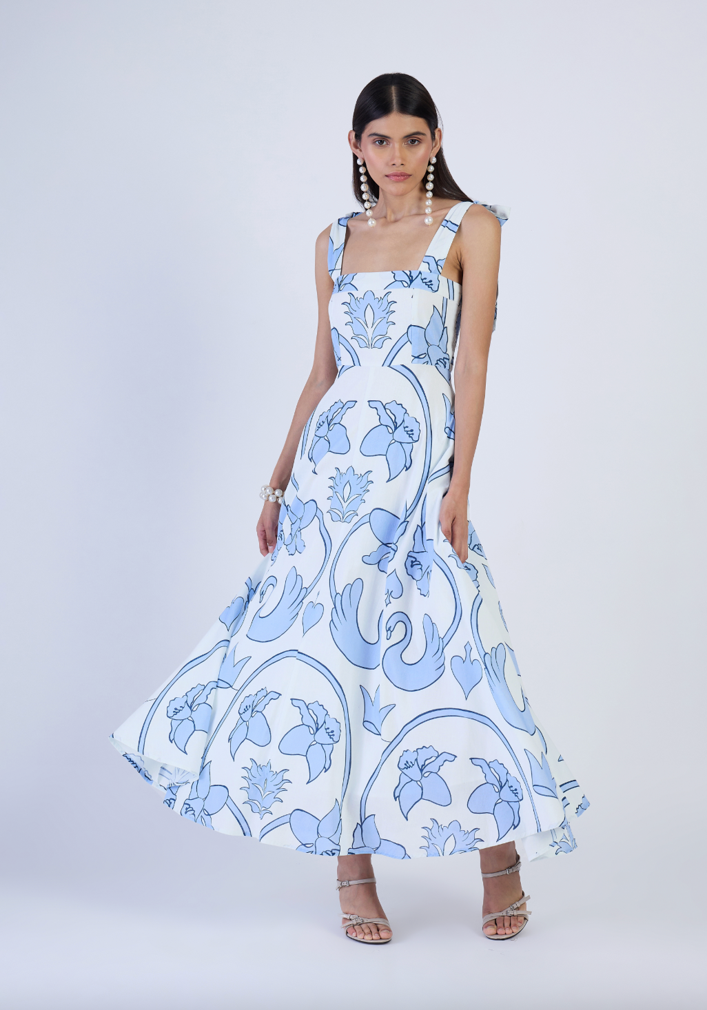 Discover Pearl, a striking silhouette with a square neckline and fitted bodice, complemented by adjustable tie shoulder straps. The wide, airy A-line skirt adds an enchanting play of shape and movement. Effortlessly chic and full of style, it's the ultimate choice for standing out at any event. Pearl is crafted from a unique blend of cotton and linen, offering a soft, breathable feel and a beautifully textured finish. Channeling the quiet glamour of Monaco’s golden era, this print is designed for a modern Grace Kelly. Bold motifs of swans, crowns, and daffodils reference royal heritage and refined glamour.
