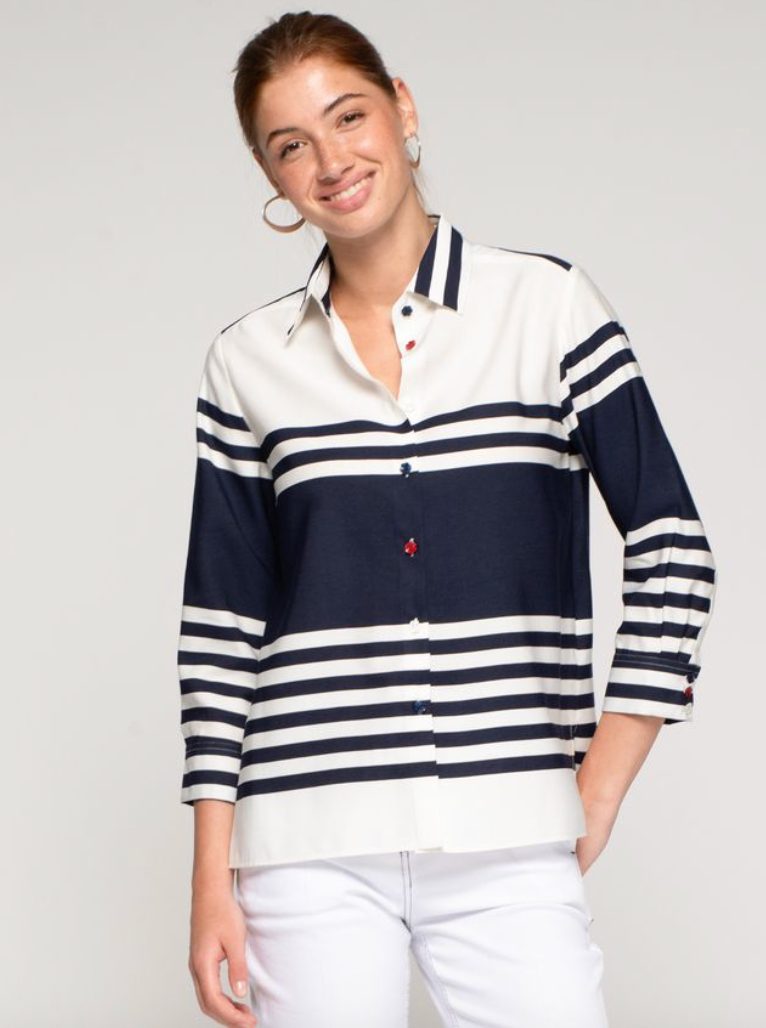The Tiffany Shirt in Navy/White Stripe is a wardrobe staple with effortless appeal. Featuring a crisp striped pattern and a flattering, easy fit, this piece is perfect for polished everyday wear—whether styled for the office or dressed down for weekends.